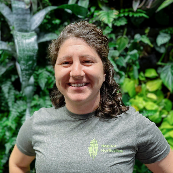 Karianne has been with Habitat since 2020, where she keeps our living walls healthy by leading pest and disease prevention efforts, using biological controls and careful monitoring. Before joining the team, she worked as a plant science lab technician at an indoor vertical farm focused on aeroponics. Karianne holds a degree in agricultural and environmental plant sciences from Cal Poly San Luis Obispo, with a concentration in plant protection. Her passion for ornamental horticulture took root while managing greenhouses and growing succulents. Outside of work, she’s spent over a decade volunteering as a tropical landscaper, earning multiple design awards.